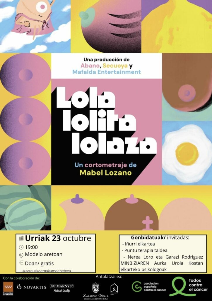 Con motivo del Día Internacional contra el Cáncer de Mama, el Ayuntamiento de Zarautz, a través de su Concejalía de Igualdad, ha organizado un evento especial. La cineasta y activista Mabel Lozano presentará su cortometraje «Lola, Lolita, Lolaza», que ha presentado a los Premios Goya 2025.Fecha: Jueves 23 de octubre de 2025Hora: 19:00 hLugar: Sala de Modelos
